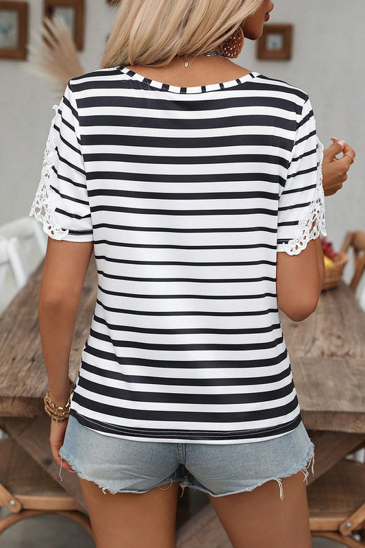 Black Stripe Cross Straps Hollowed Neck Lace Splicing Short Sleeve Blouse