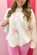 • Pink Bow Print Ribbed Trim Exposed Seam Drop Shoulder Loose Sweater
