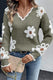 • Seagrass Plush Flower Pattern Scalloped Trim V Neck Sweater