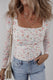 White Floral Print Textured Square Neck Slim Fit Long Sleeve Top