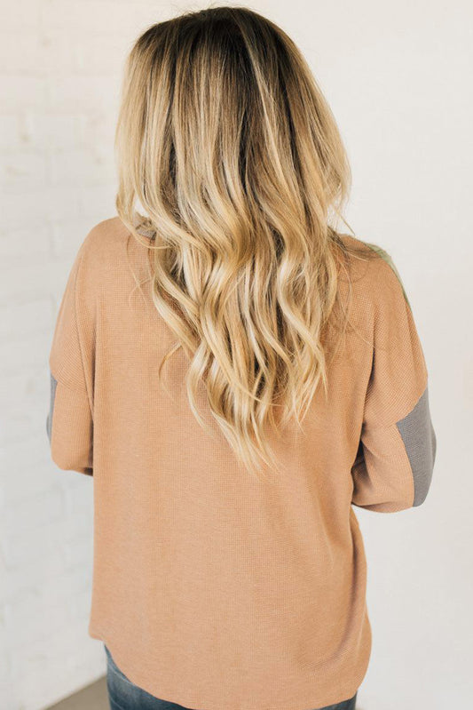 Buckskin Color Block Thermal Textured Knit Drop Shoulder Henley Top
