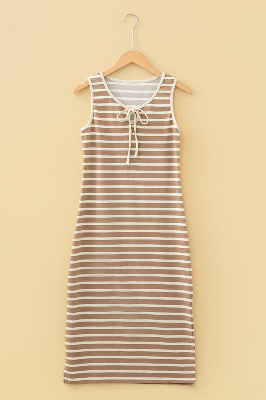Khaki Stripe Tie V Neck Sleeveless Side Slit Midi Dress