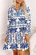 Blue Ethnic Print Striped Split Neck Long Sleeve Flowy Mini Dress