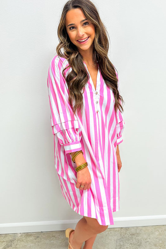 Rose Stripe Bracelet Sleeve Buttons Loose Mini Dress