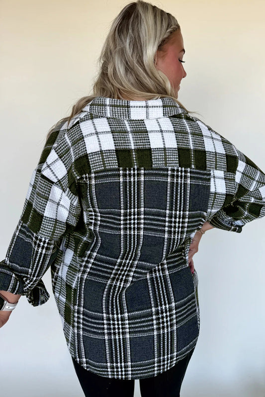 Grass Green Plaid Patchwork Waffle Thermal Knit Shacket