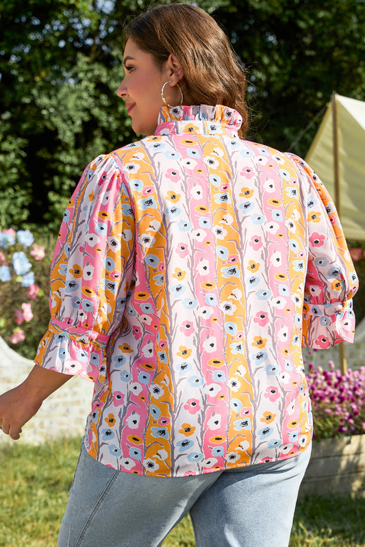 Pink Floral Ruffled Collar Bracelet Sleeve Plus Size Blouse Top
