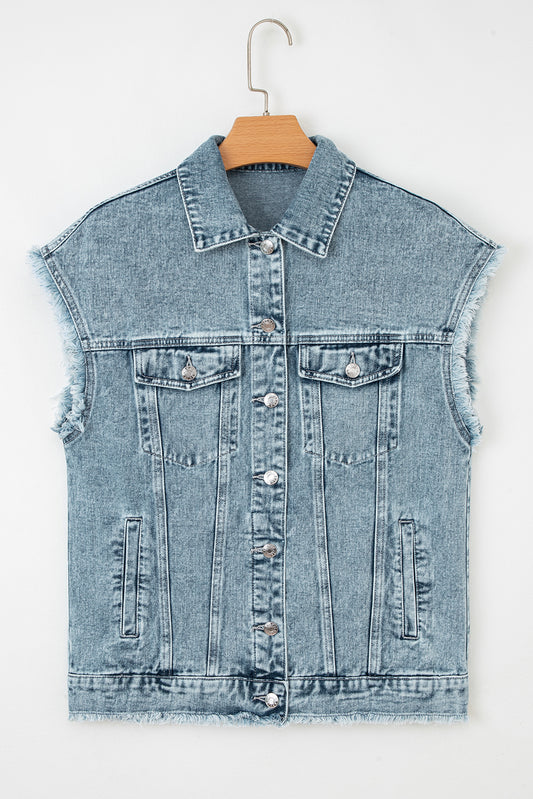 Beau Blue Frayed Edge Flap Pockets Denim Vest Jacket