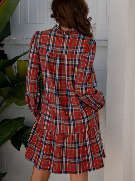 Plaid Print Frilly Collar Long Sleeve Shift Mini Dress