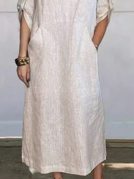 Full Size Round Neck Roll-Up Sleeve Midi Dress Plus Size