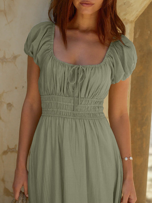 V-Neck Puff Short Sleeve Midi Dress