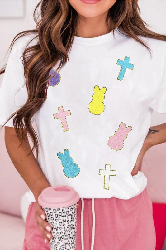 White Chenille Bunny Cross Patch Easter T Shirt