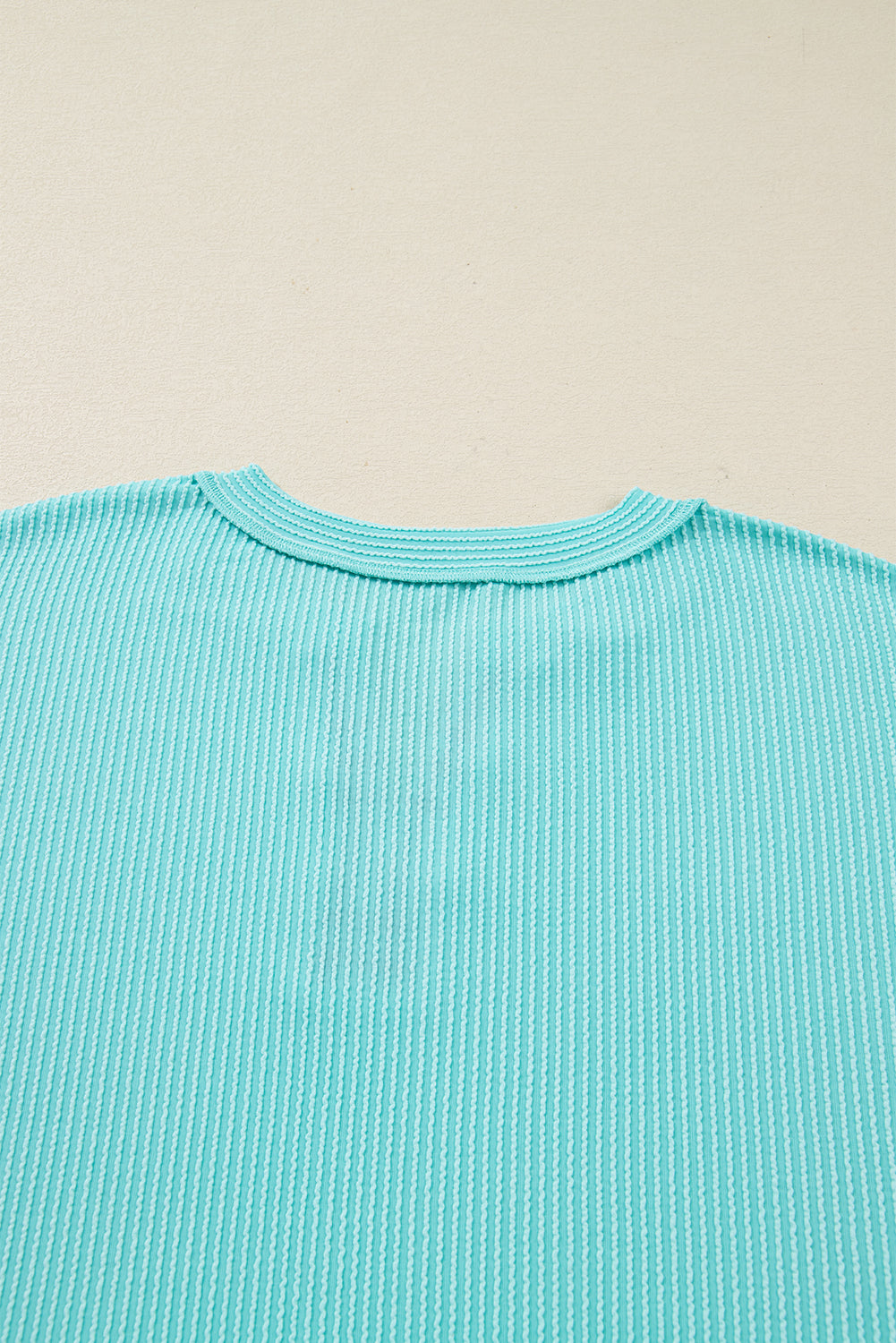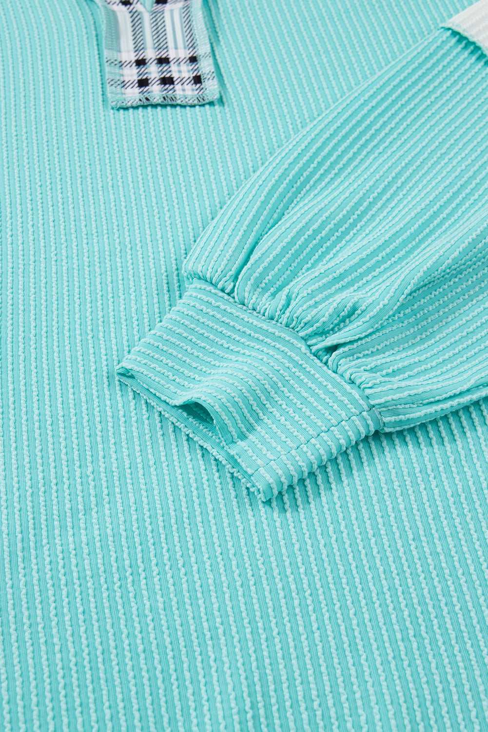Aruba Blue Twist Ribbed Color Block Plaid Patchwork Plus Size Long Sleeve Top