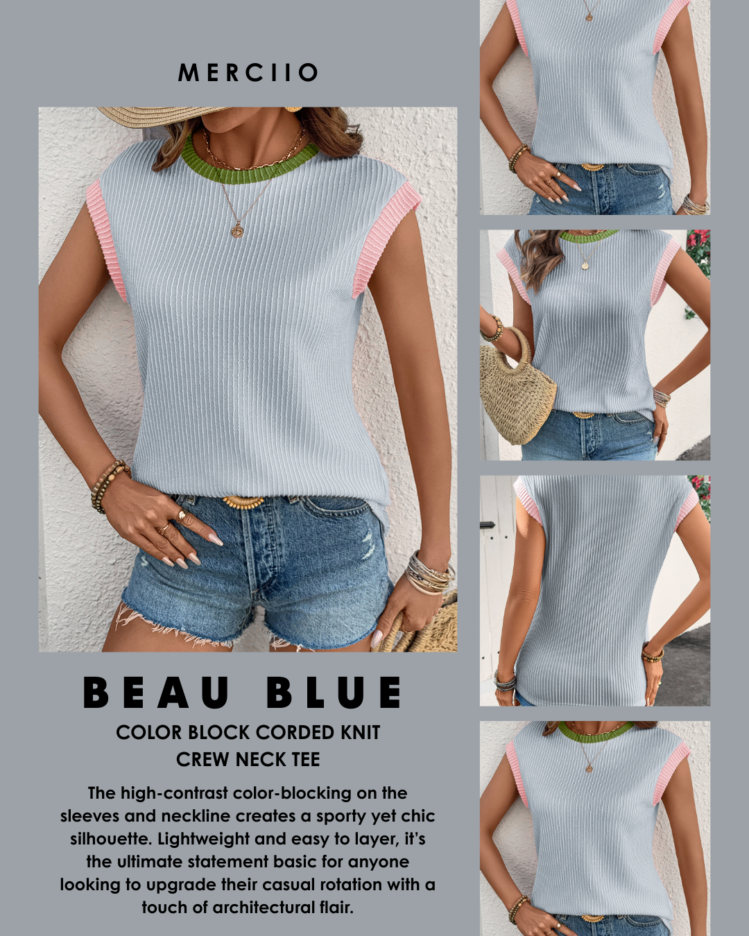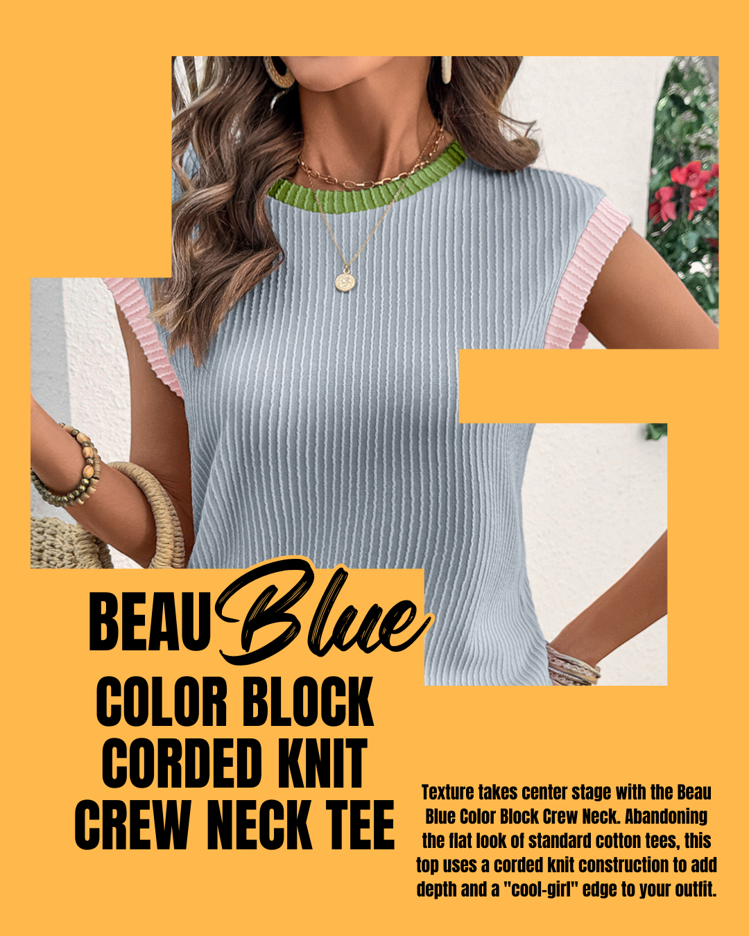 Elevate your everyday wardrobe with our Beau Blue Color Block Corded Knit Crew Neck Tee. Featuring a unique wavy textured corded knit, this top combines a sophisticated color-block design with a refreshing Beau Blue palette. Designed with a classic crew neck and short sleeves, it offers a flattering fit that transitions seamlessly from a casual morning coffee to a polished afternoon meeting.