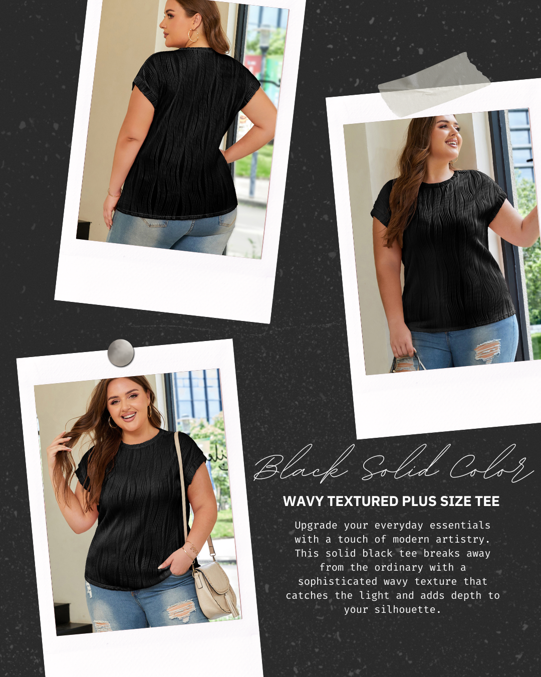 Experience the perfect blend of breathability and stretch. This plus-size tee is crafted from high-quality, lightweight fabric that drapes beautifully over curves without clinging. The solid black color offers maximum versatility, while the intricate wavy weave provides a premium feel that resists wrinkling. It’s more than just a t-shirt; it’s a wardrobe essential that feels as good as it looks.