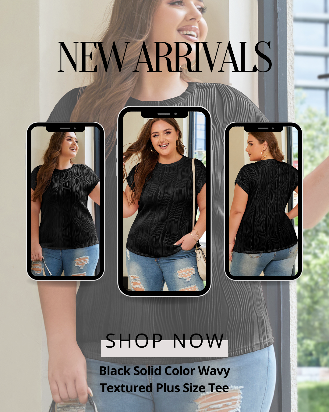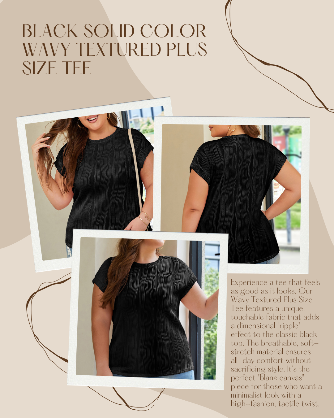 Elevate your everyday basics with our Black Wavy Textured Tee. Designed specifically for the modern plus-size silhouette, this top features a unique, tactile wavy pattern that adds depth and sophistication to a classic black tee. Whether you're layering it under a blazer for a professional look or pairing it with your favorite denim for a casual weekend, the rich texture ensures you stand out without saying a word.