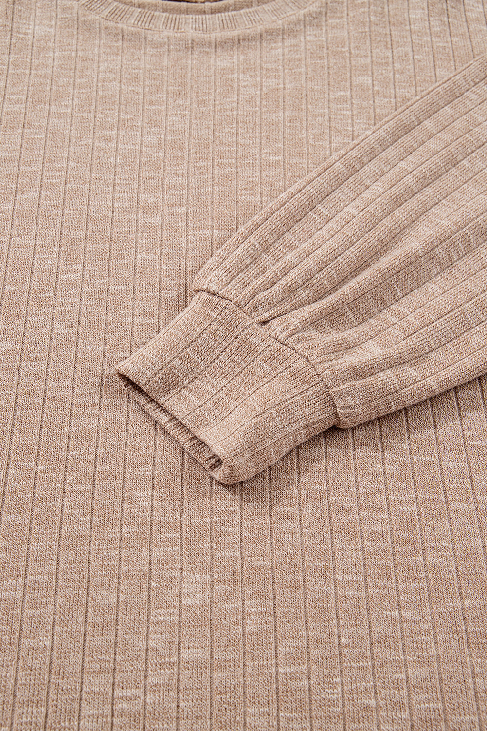Dark Khaki Ribbed Balloon Sleeve Pullover Top and Biker Knitted Short Set