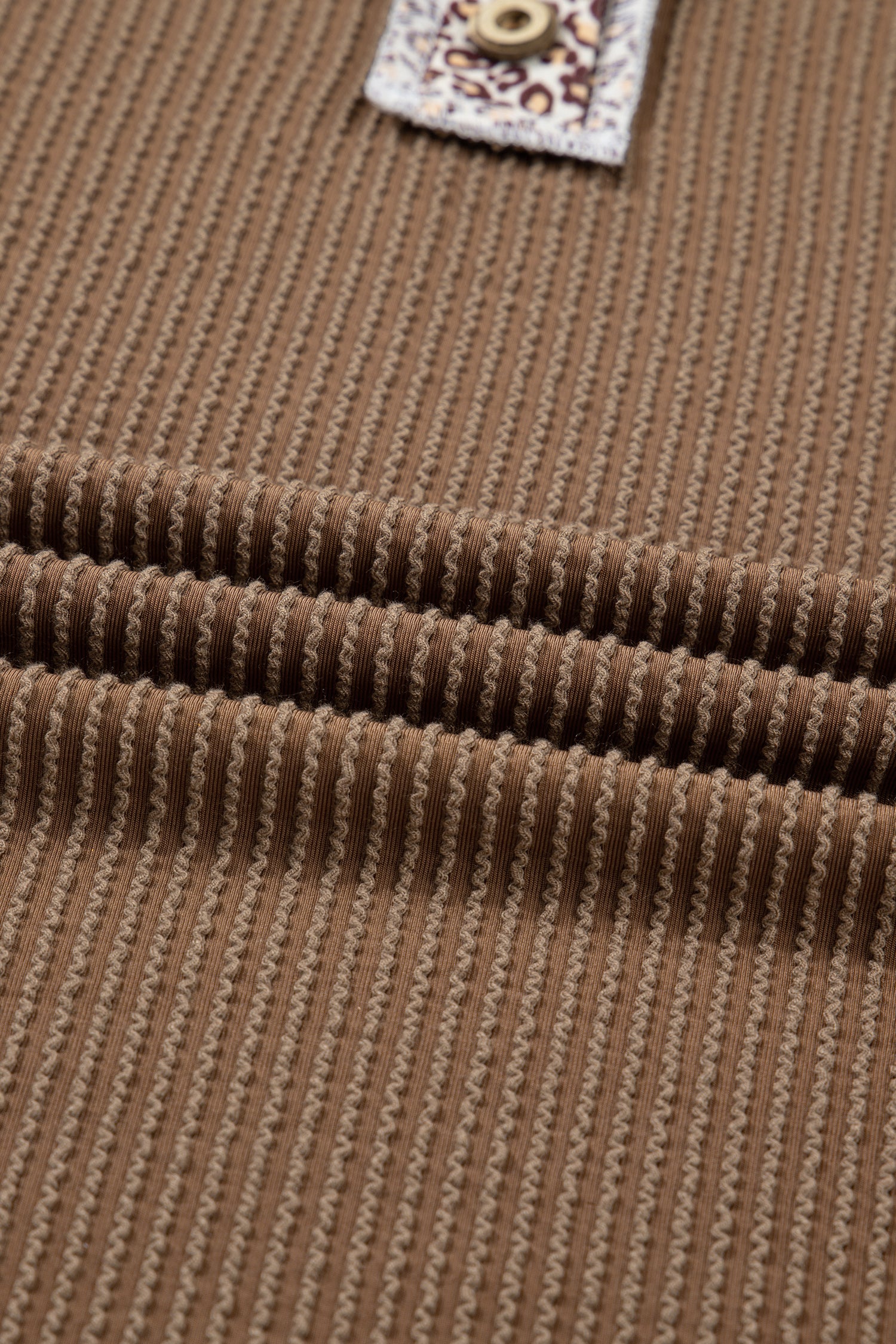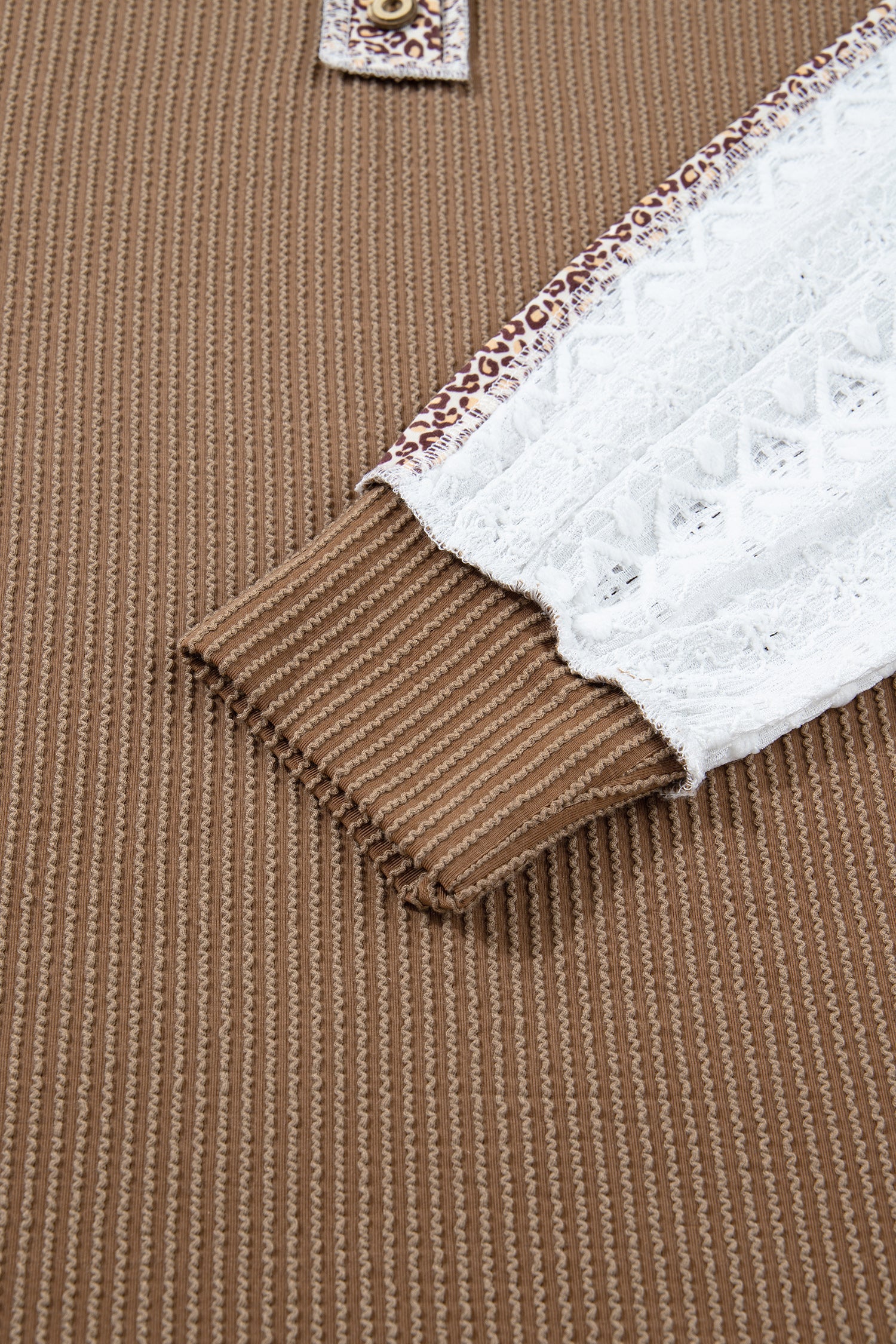 Dark Khaki Twisted Ribbed Leopard Lace Contrast Patchwork Long Sleeve Top