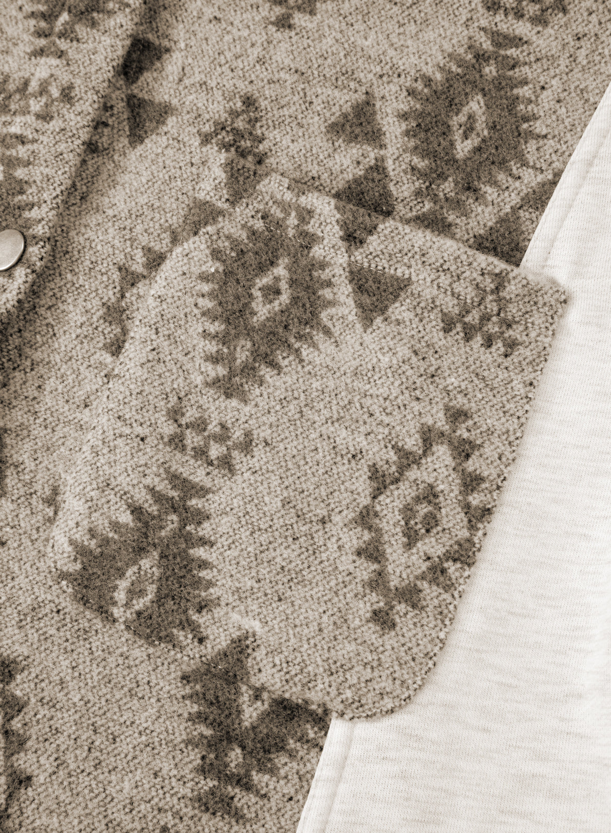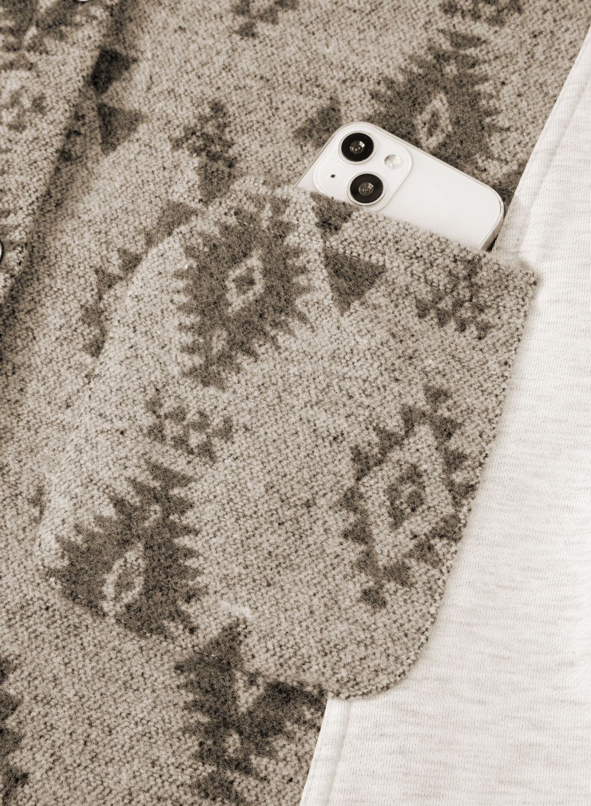 • The Aztec print patchwork adds this chic shacket a touch western flair.