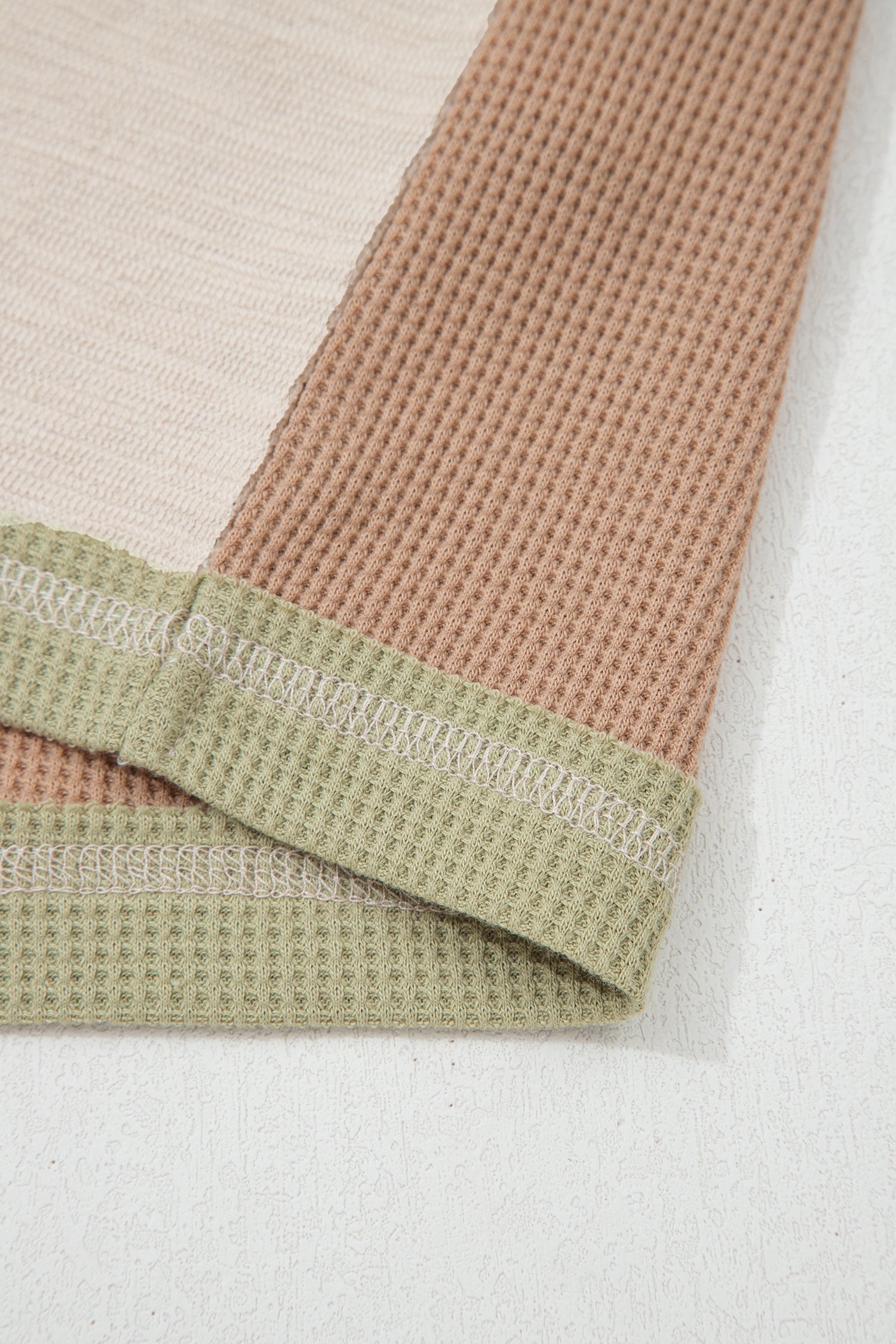 Waffle knit fabric patchwork adds unique texture to this v neck top.