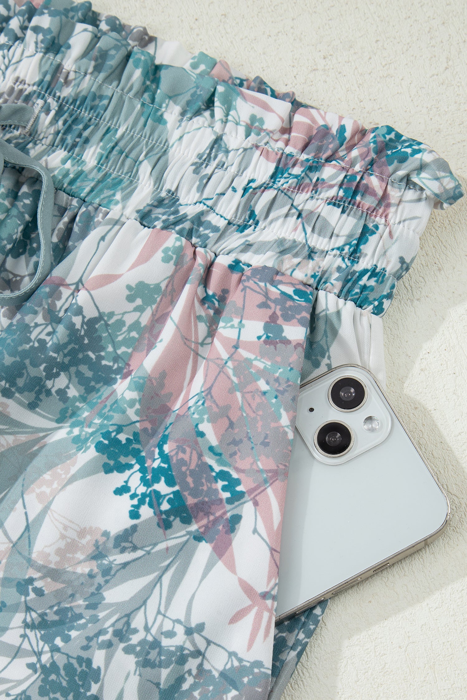Matching high-waist pants have an elastic waistband and a wide-leg silhouette.