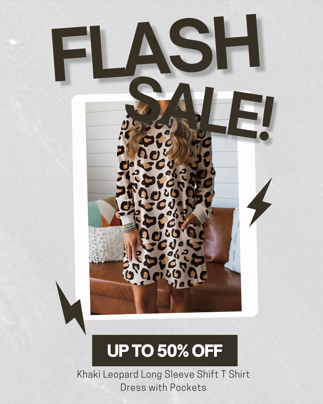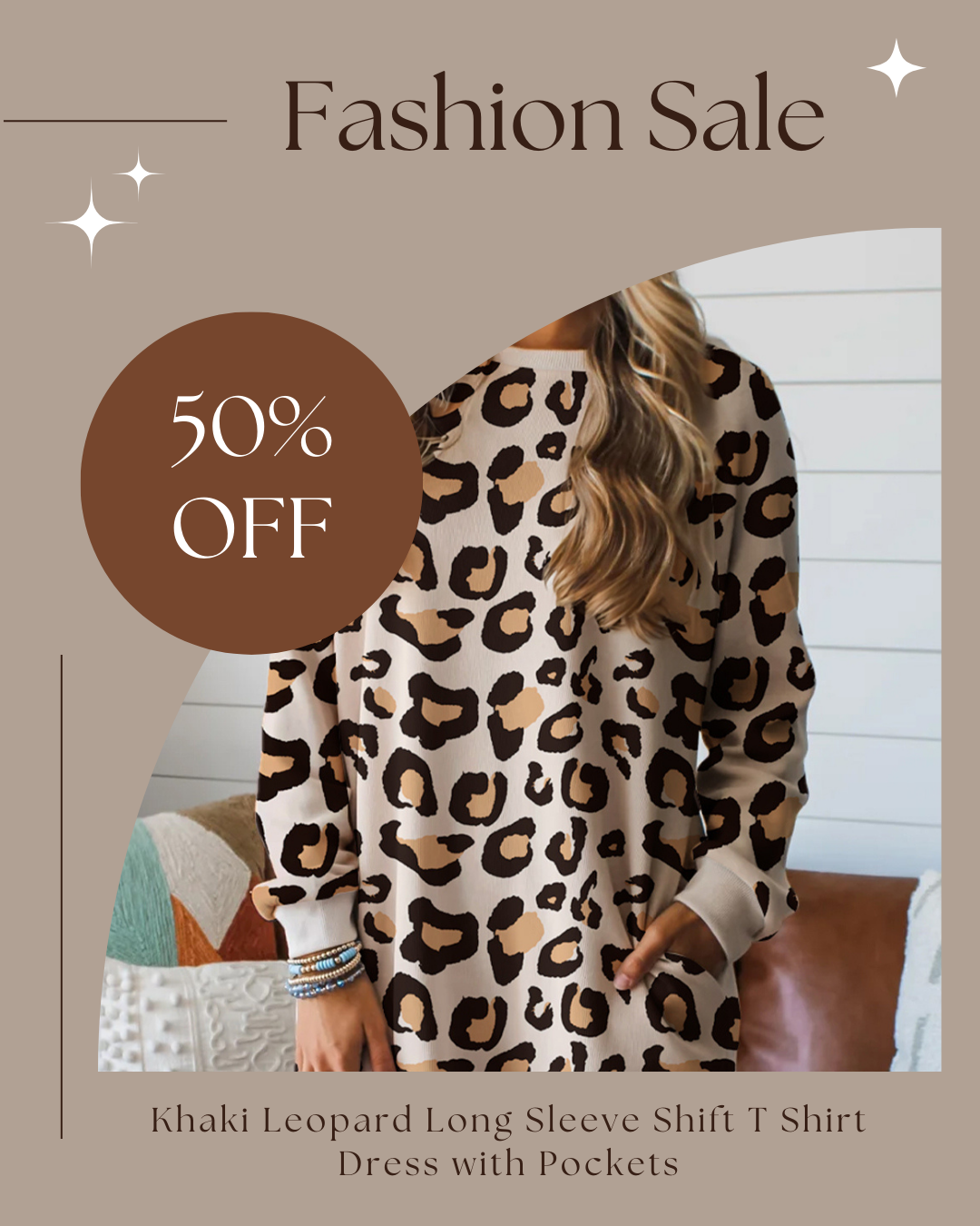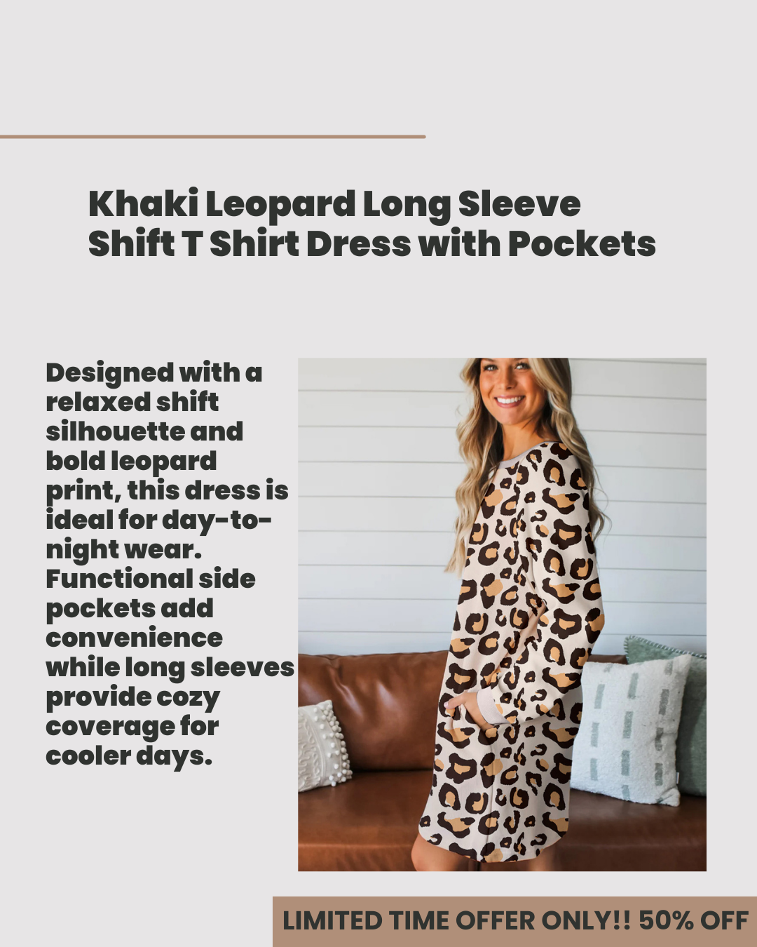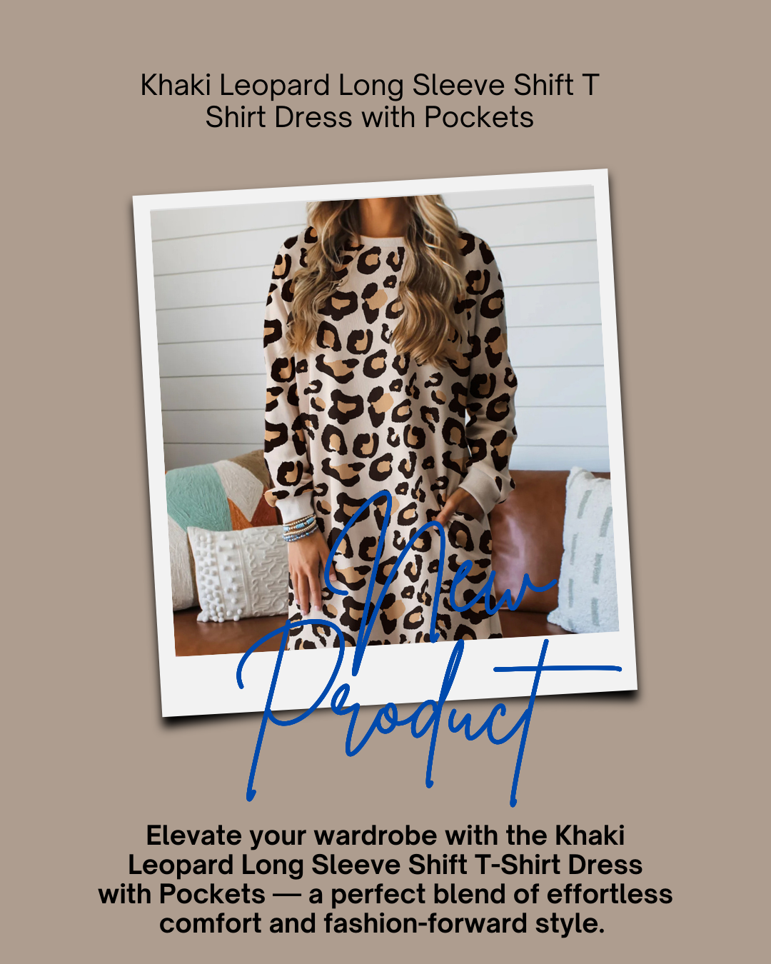 Upgrade your everyday outfits with this eye-catching Leopard Print Shift T-Shirt Dress in classic khaki tones. The long sleeve design gives a laid-back yet polished vibe, and the side pockets offer convenience for your essentials. Its relaxed cut is flattering on every figure and makes styling a breeze — slip on sandals for a light look or layer with a jacket for cooler days. Perfect for brunch, errands, or casual outings!