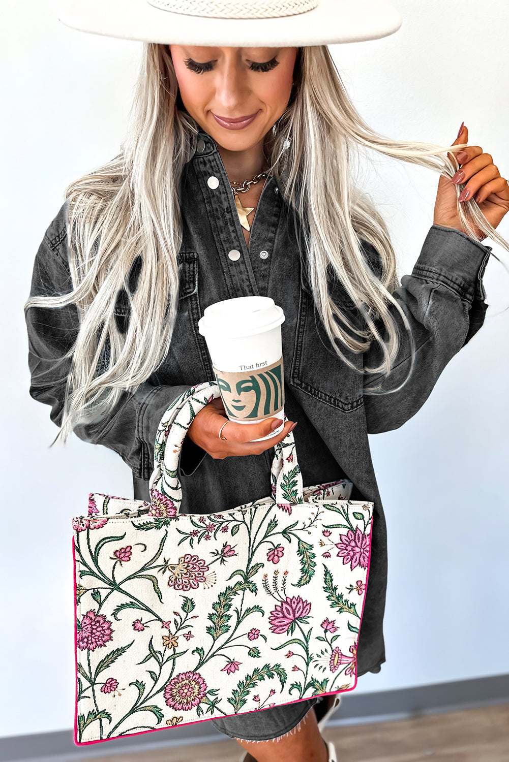 Designed with snap buttons, flap pockets, and raw edge hemline.