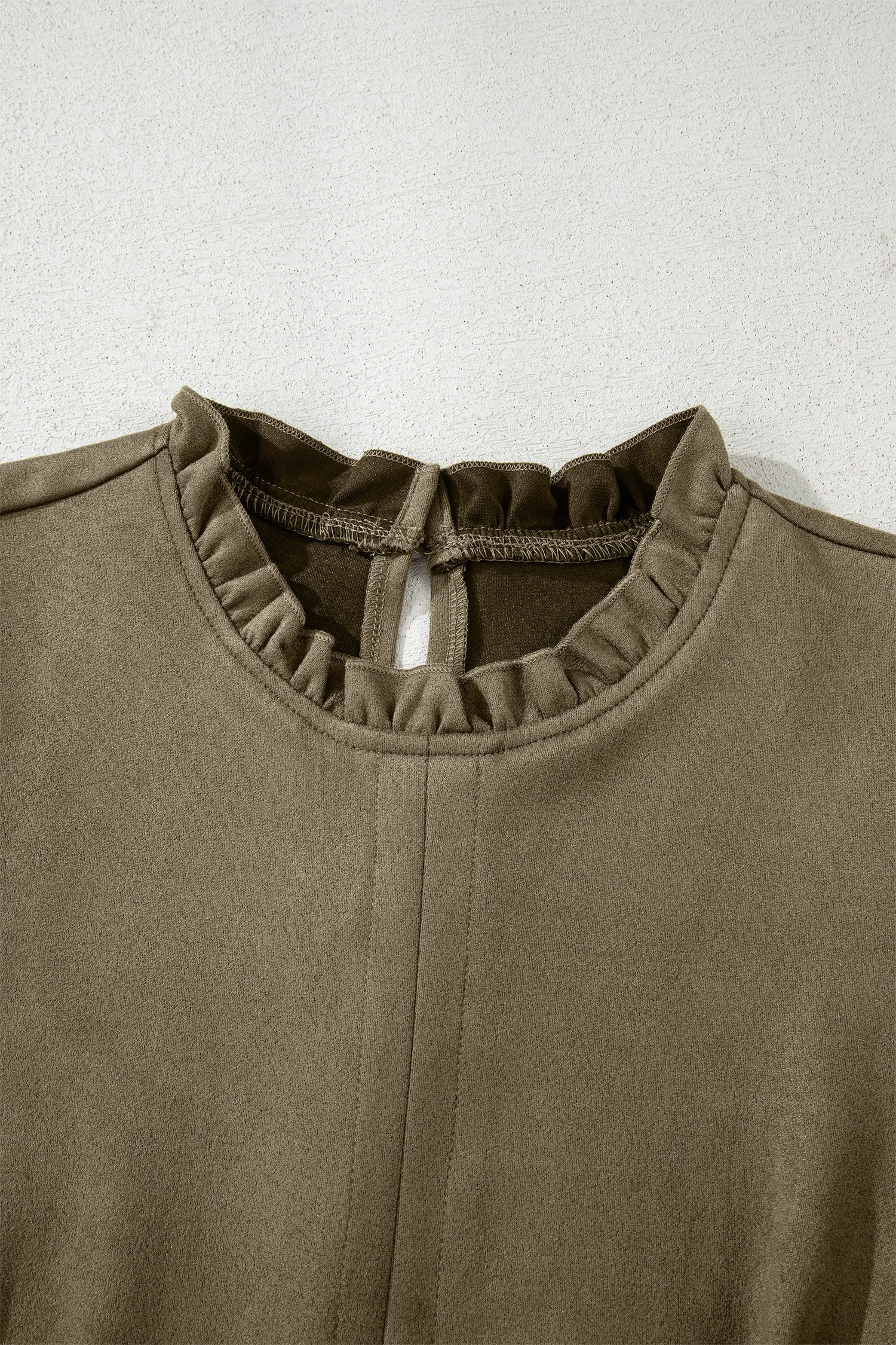 • Charming frilled round neckline adds a romantic, feminine touch.