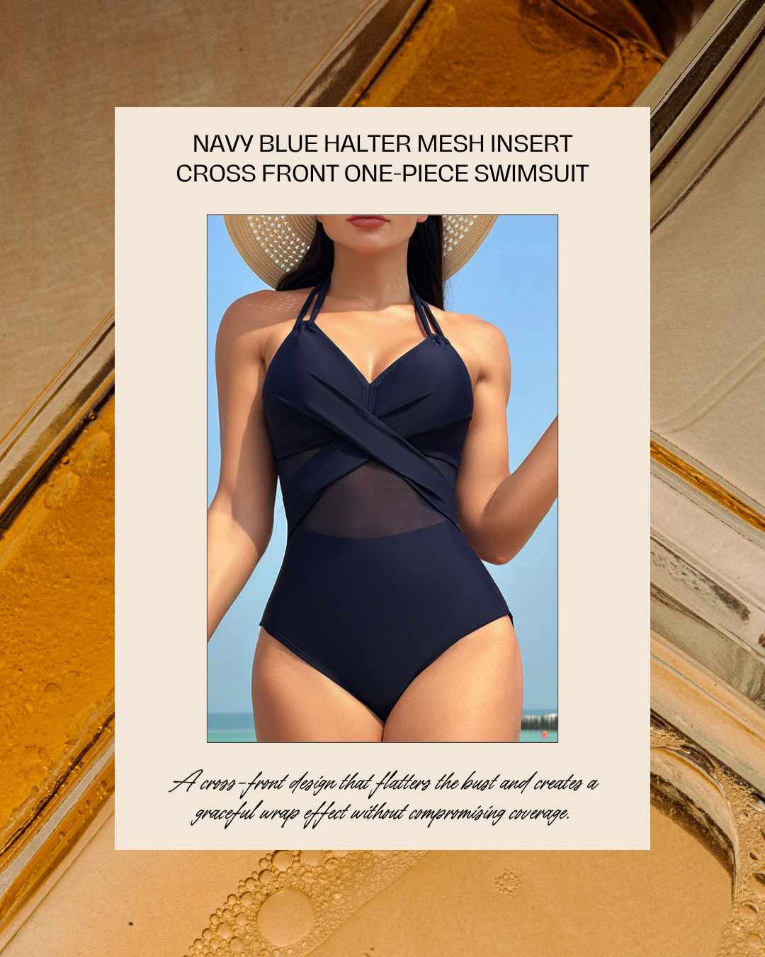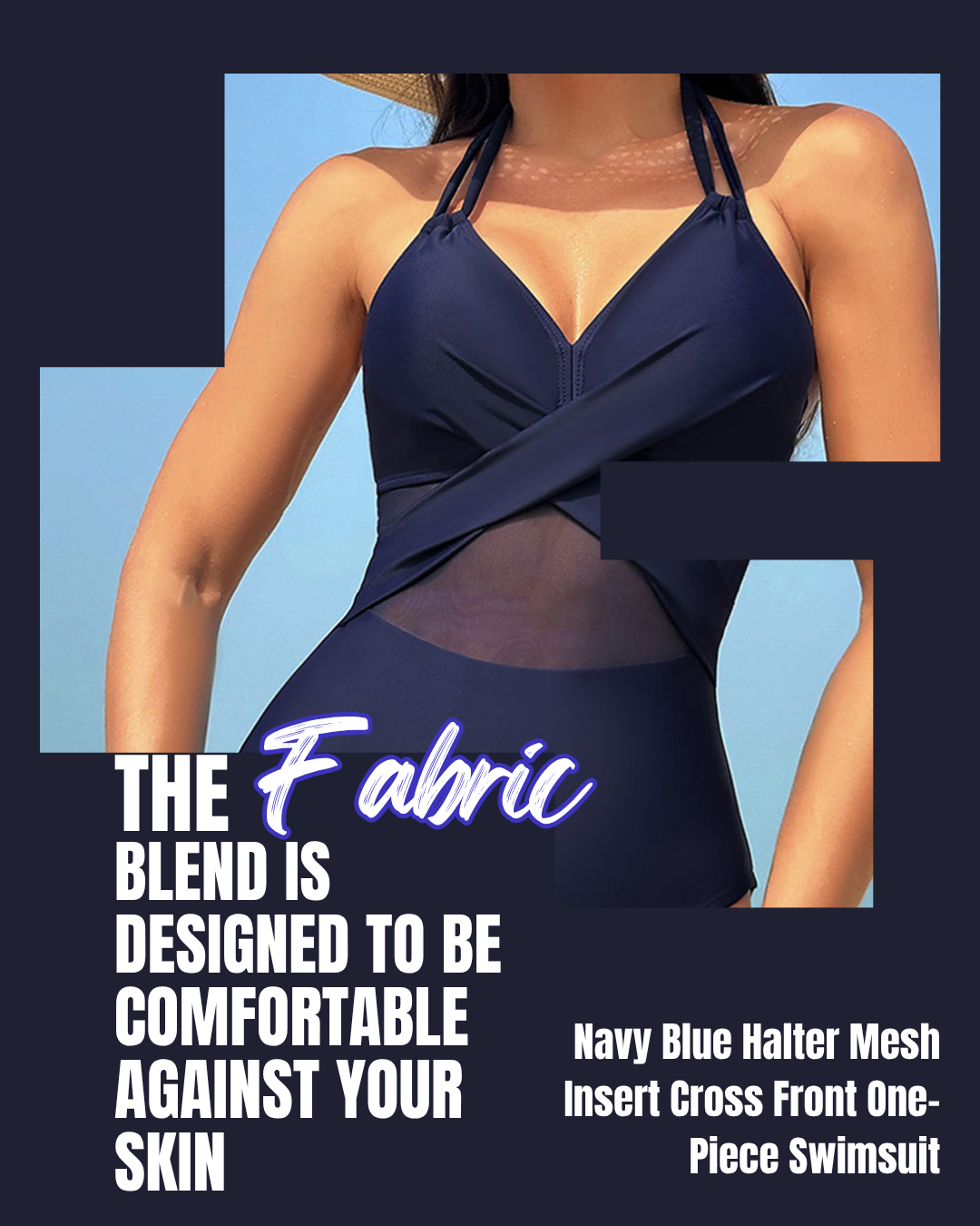 Why Choose the Navy Blue Halter Mesh Insert Cross Front One-Piece Swimsuit?