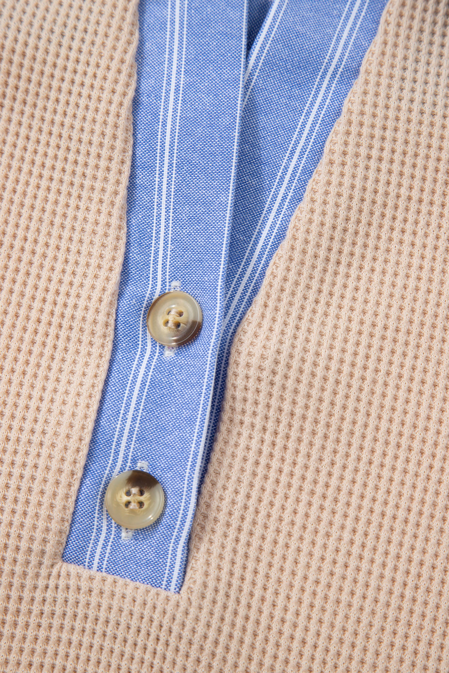 • This plus top showcases a waffle knit body and contrast striped patchwork.