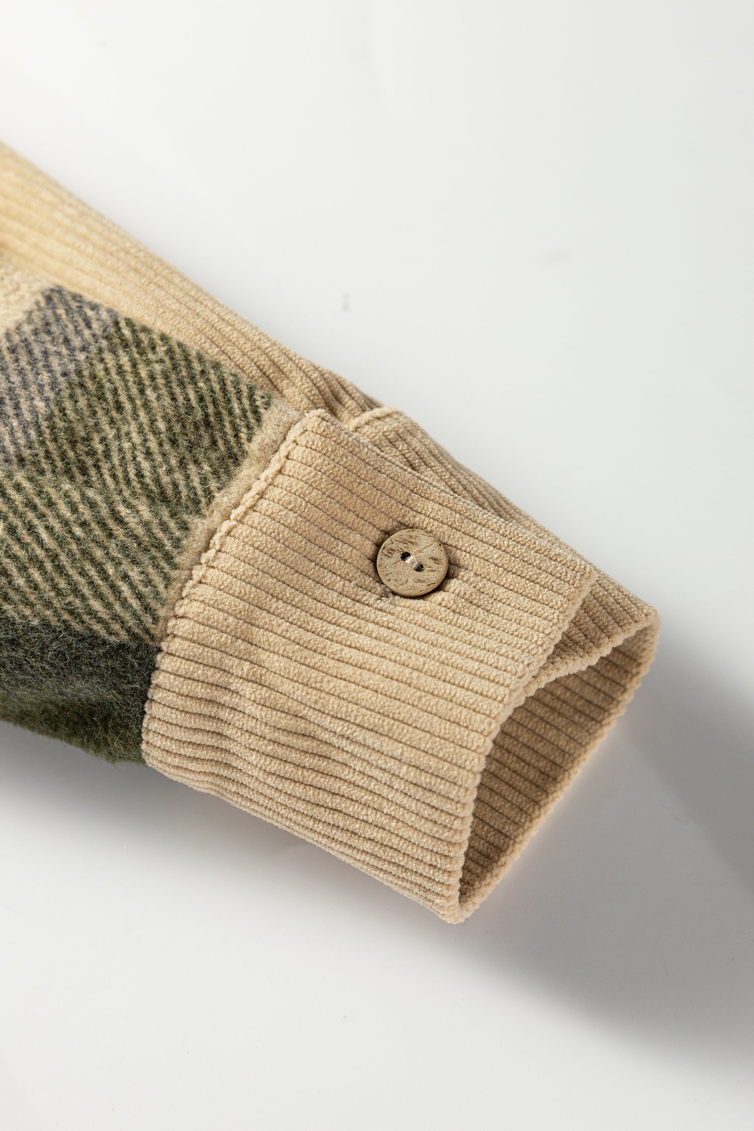 Trendy brushed plaid shacket with retro corduroy patchwork design.