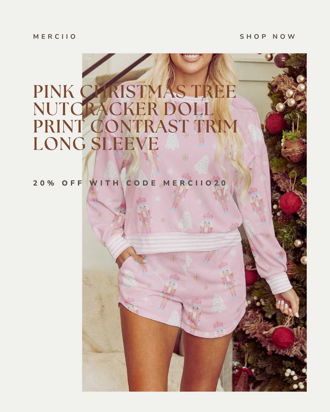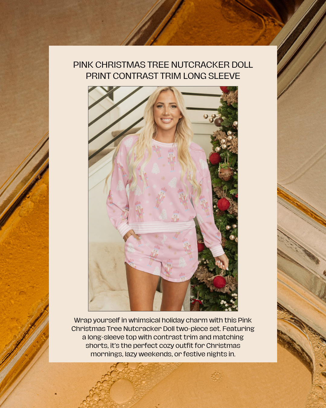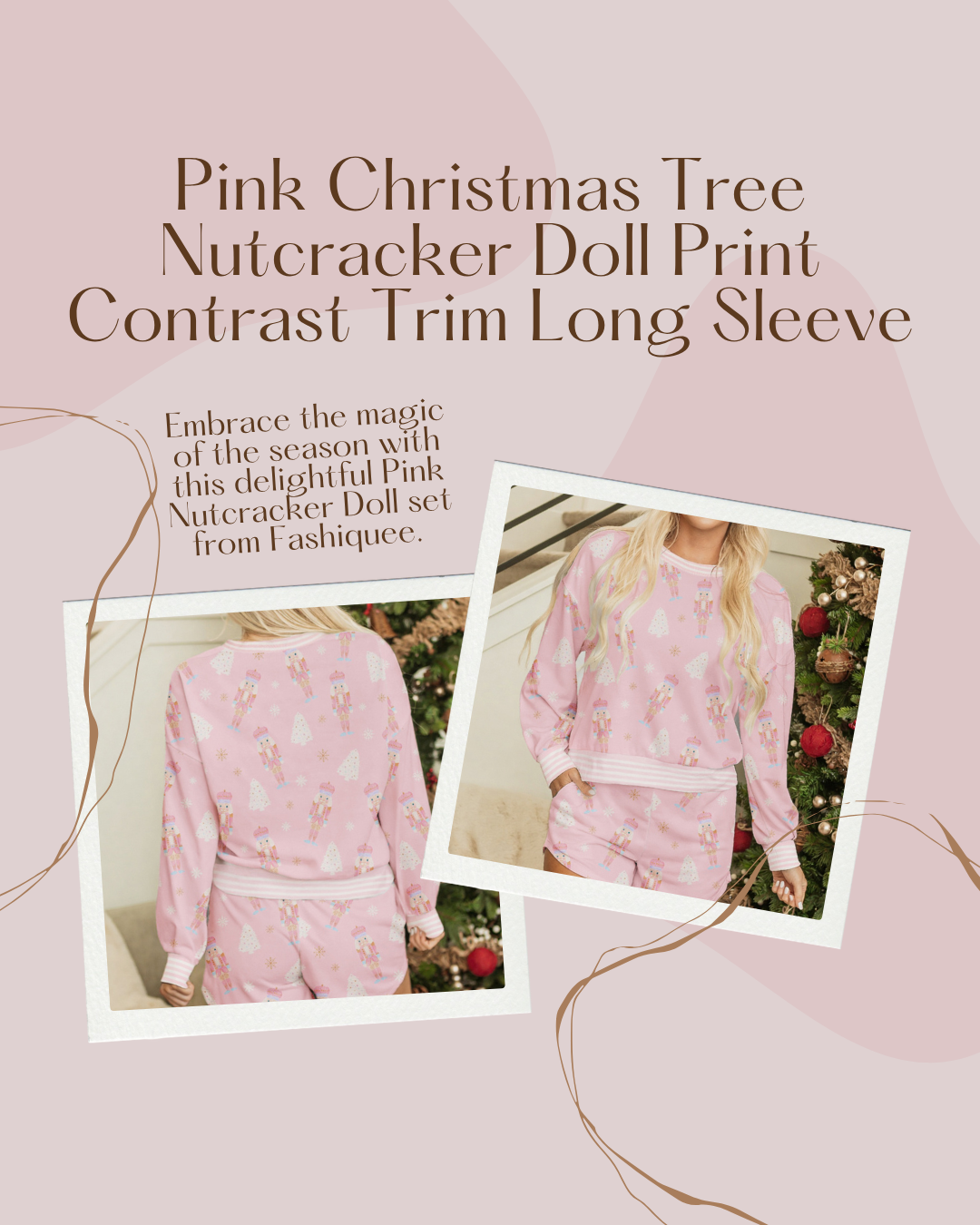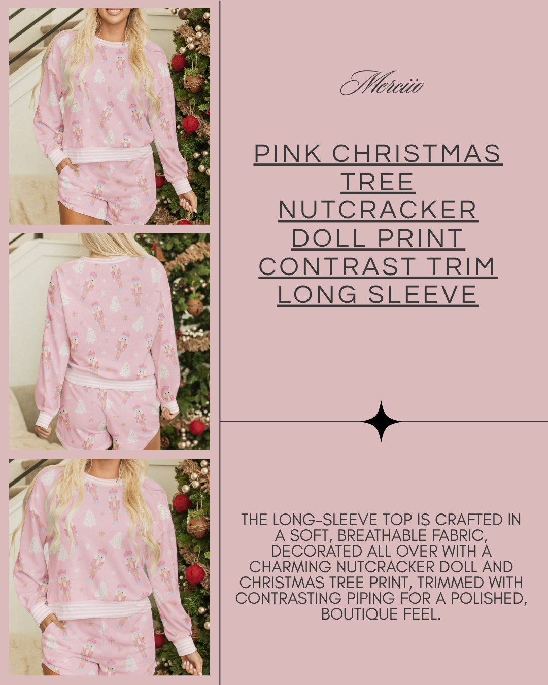Pink Christmas Tree Nutcracker Doll Print Contrast Trim Long Sleeve Top Matching Shorts Set Images
