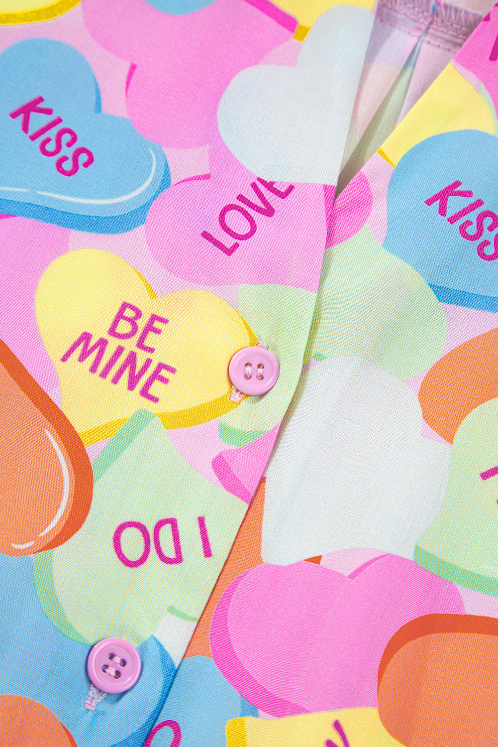 • Valentines Day pajama set with candy heart print adds sweet charm to sleepwear style.