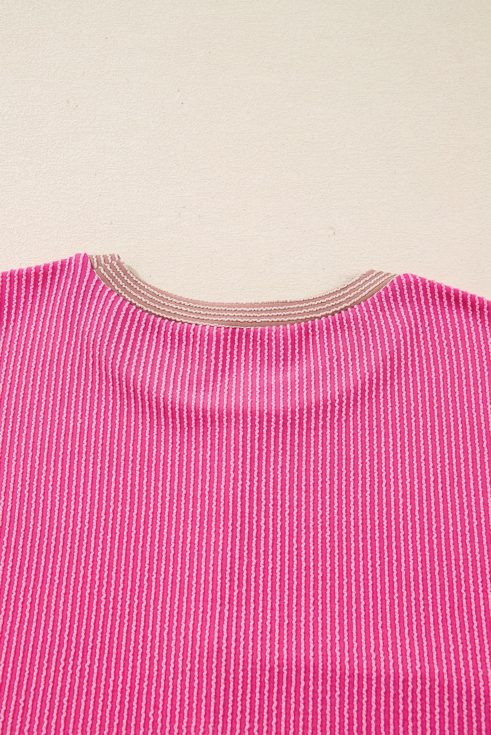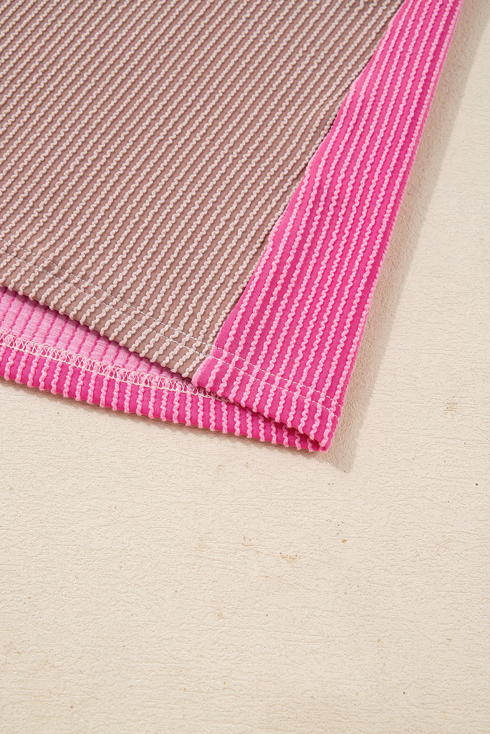 Rose Red Plus Size Twisted Ribbed Color Block Leopard Patchwork Long Sleeve Top