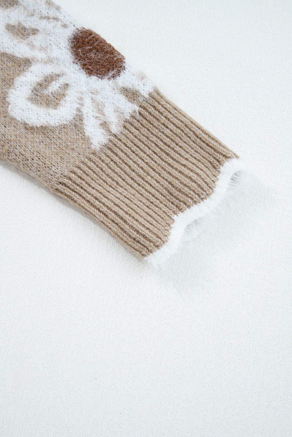 Seagrass Plush Flower Pattern Scalloped Trim V Neck Sweater