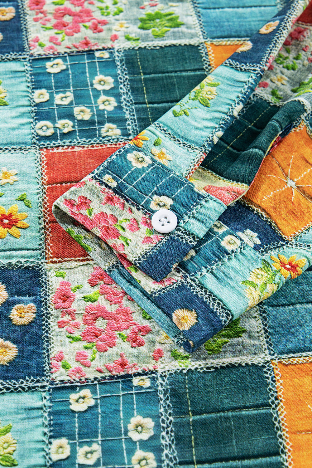 • Chic floral blouse with V neck and shirt collar for a stylish look.