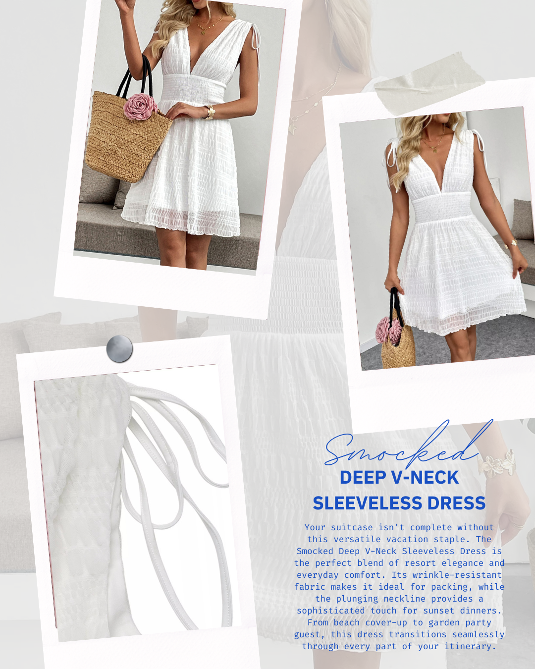 Embrace the sunshine in our Smocked Deep V-Neck Sleeveless Dress, the ultimate blend of comfort and sophisticated charm. This piece features a plunging neckline that beautifully frames your collarbone, while the intricate smocked waist provides a tailored silhouette without sacrificing comfort. Crafted from lightweight, airy fabric, it’s designed to keep you cool and confident from morning garden strolls to sunset dinners.