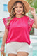 • Strawberry Pink Floral Embroidered Flutter Sleeve Pleated O Neck Plus Size Blouse