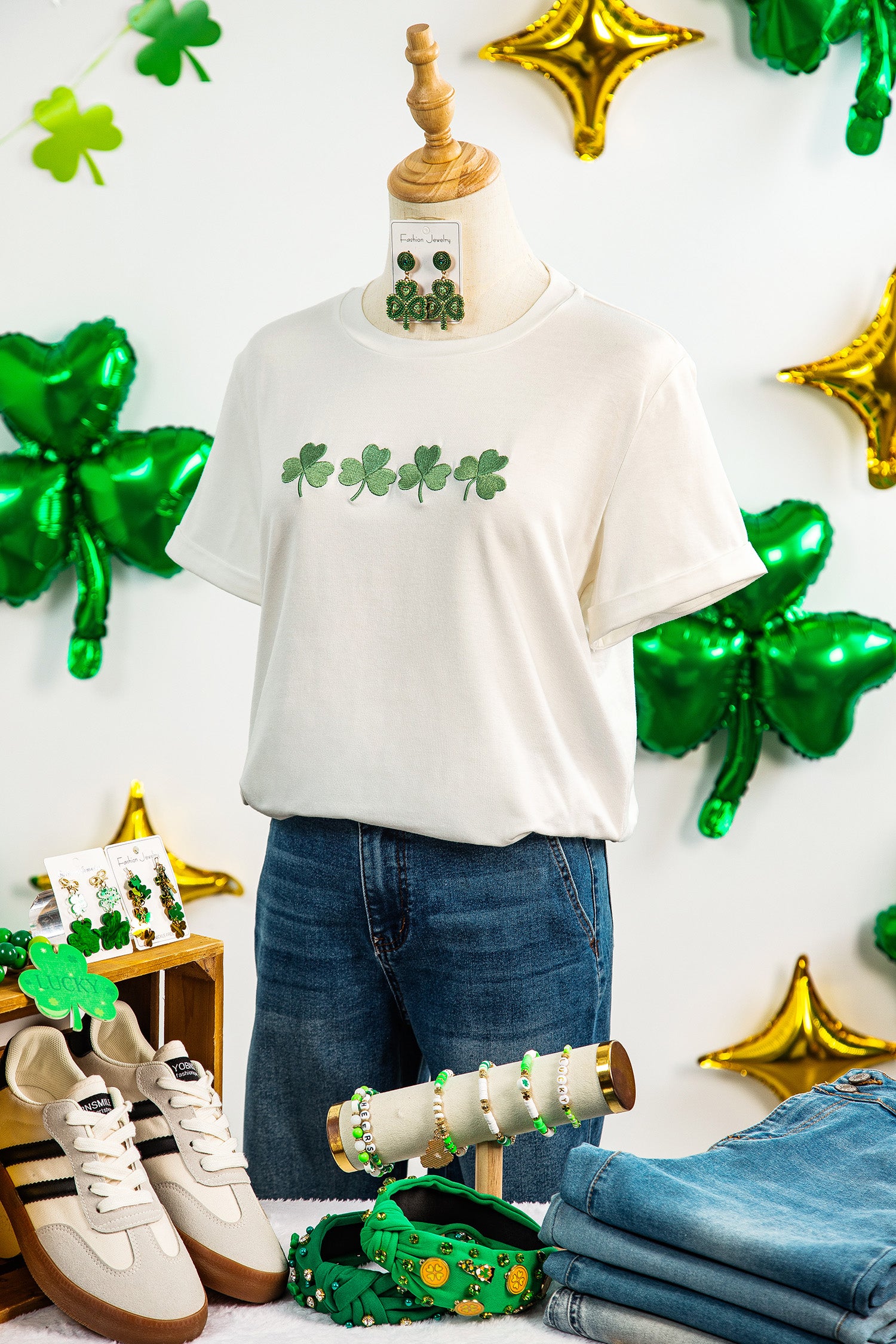 White Embroidered Clover St Patricks Fashion Graphic Tee